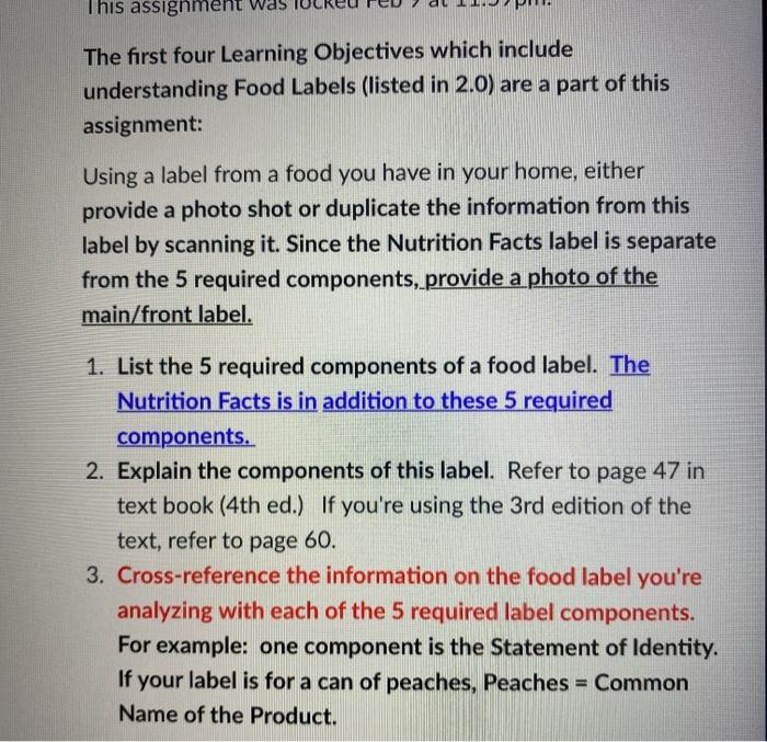 Solved: List the five mandatory components found on all food label ... According to the food safety regulations, food labels have the following five components: 1. A statement of identity/name of the food 2. The net weight of the food contained inside of the package, not including the weight of the package 3. The name and address of the manufacturer, packer, or distributor 4.
